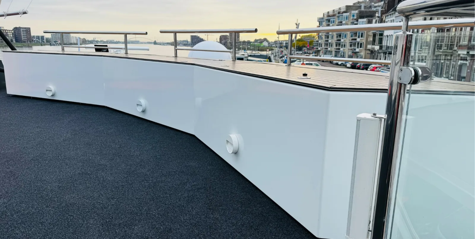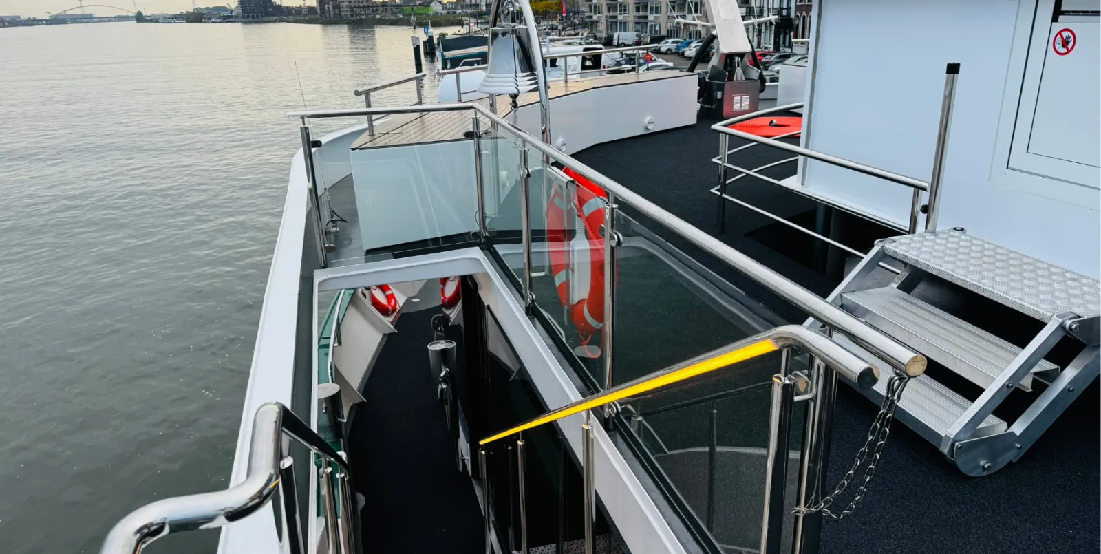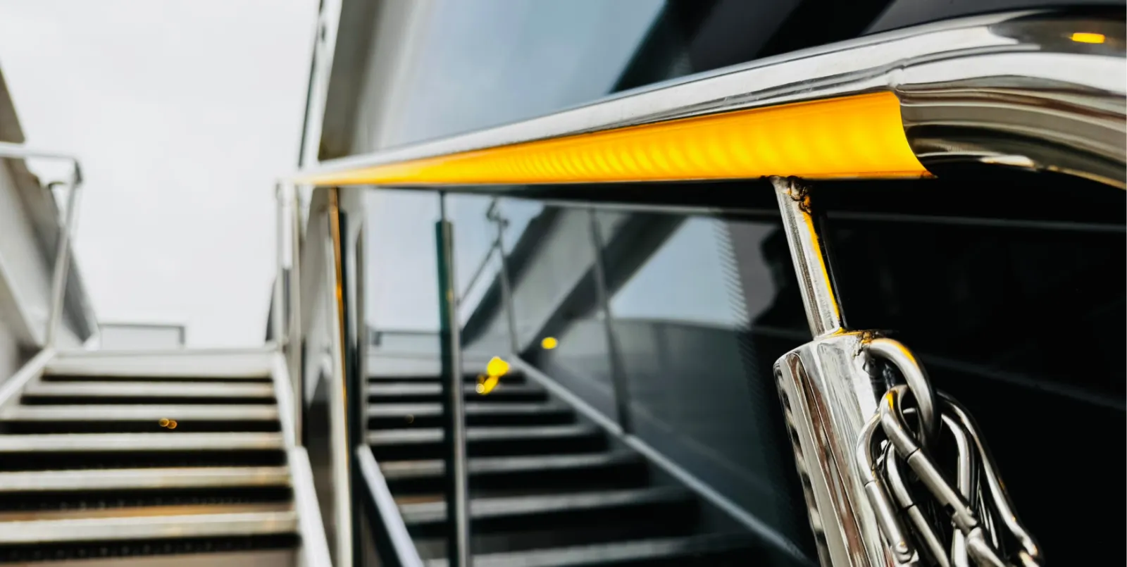 - Hoogglans gepolijst relingwerk met veiligheidsglas en geïntegreerde LED-verlichting