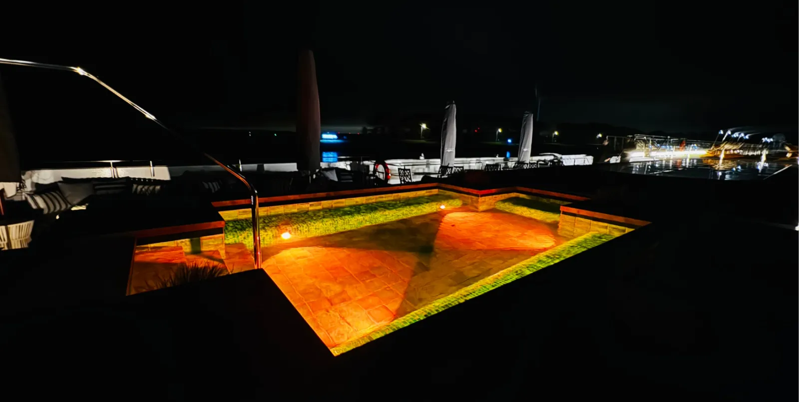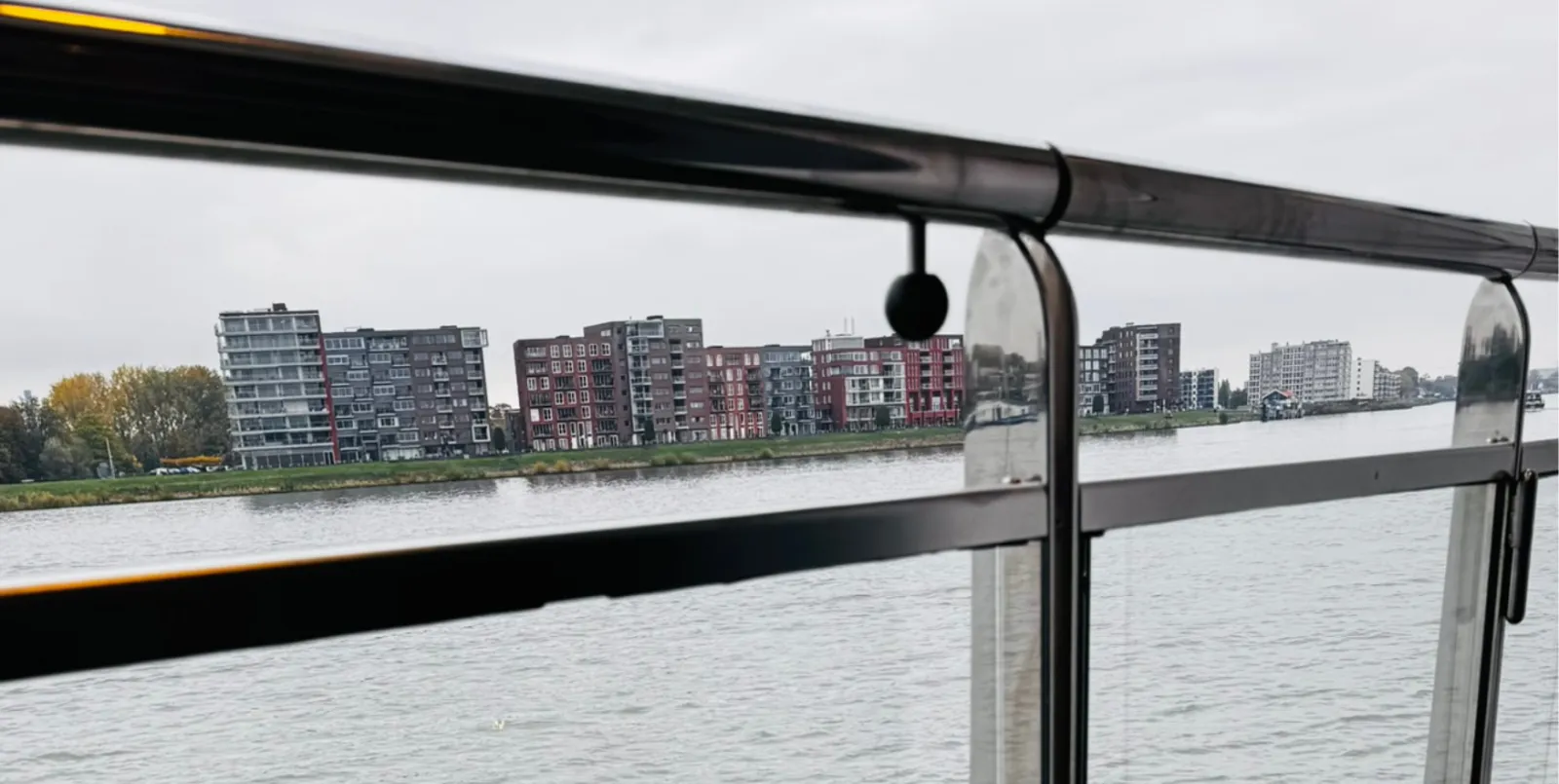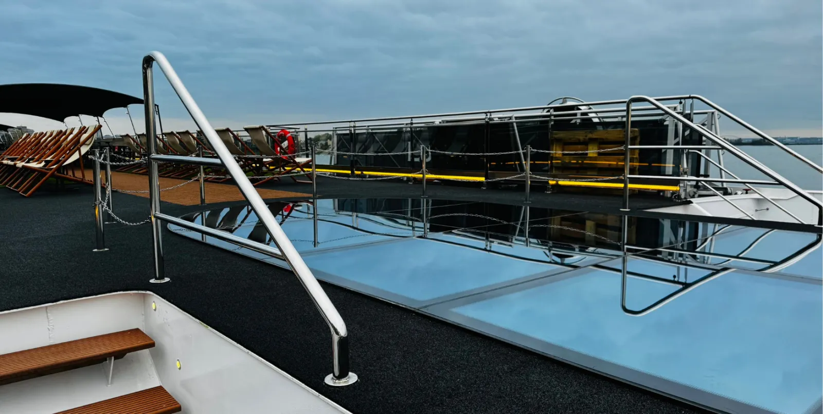 - Hoogglans gepolijst relingwerk met veiligheidsglas en geïntegreerde LED-verlichting